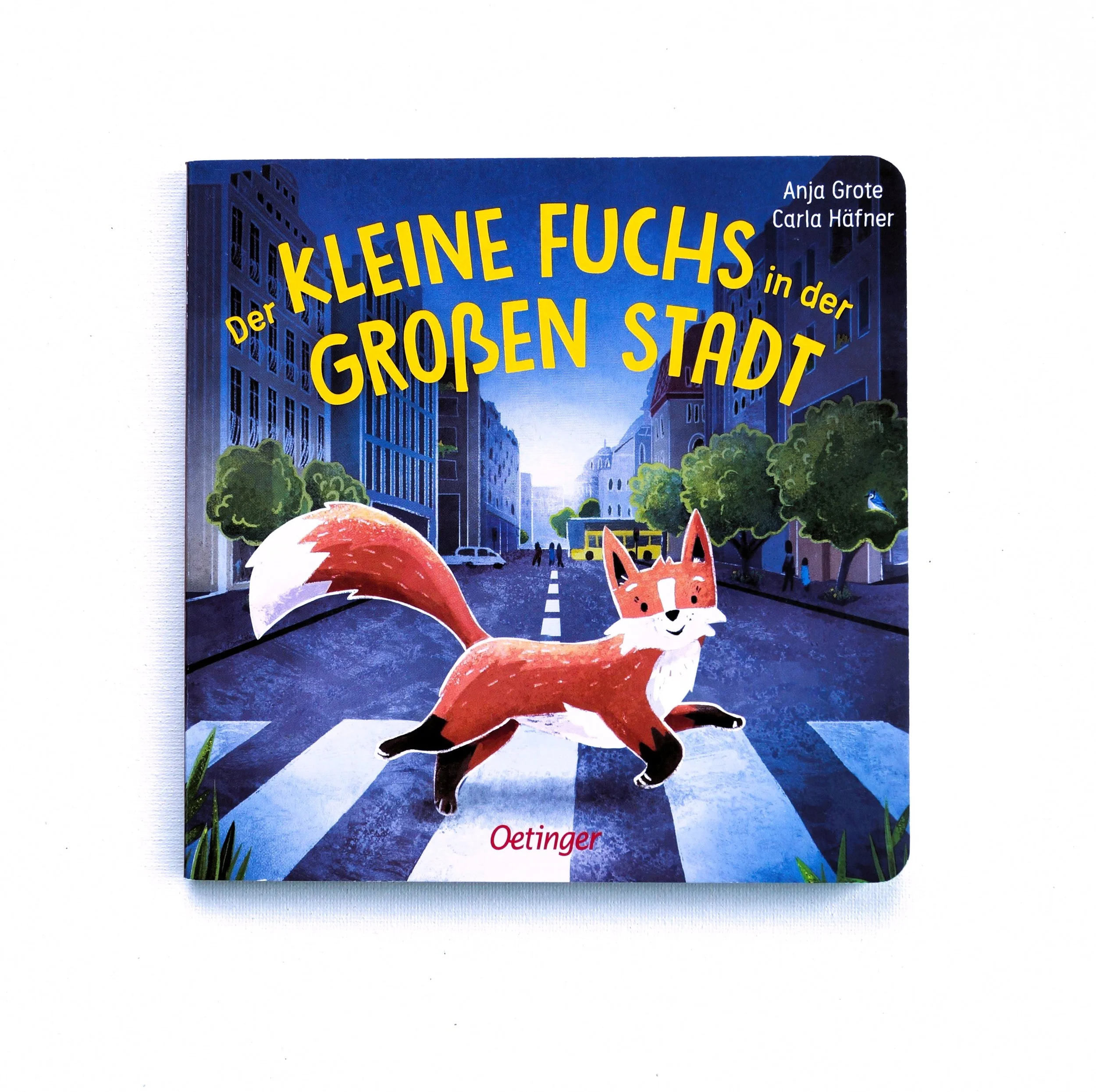 Der kleine Fuchs lebt nicht im Wald, sondern in der Großstadt. Hier fahren Straßenbahnen und Busse, hier gibt es viele Menschen und Hunde. Der kleine Fuchs hat in der Stadt seine Heimat gefunden. Tagsüber schläft er gut versteckt in einem Gebüsch. Er spielt mit dem Ball auf dem Spielplatz, trinkt Wasser aus dem Brunnen auf dem Marktplatz und stibitzt Essen aus den Mülleimern zwischen den Hochhäusern. Ob er auch heimlich in den Bus einsteigt?